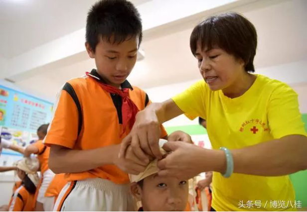 ▲5月28日,广西365bet官方游戏_线上365bet_bet28365365娱乐场柳太路小学的学生们在学习伤口包扎知识。