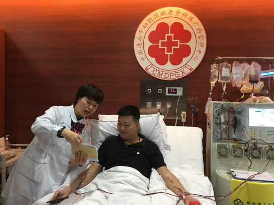 15日早上,两根管子将吴先生和造血干细胞采集机连接起来,一根管子将吴先生体内的血液输入机器,等外周血中的造血干细胞被分离出来后,另一根管子将剩余的血液成分重新送回吴先生身体里,这样的过程一直持续到中午。