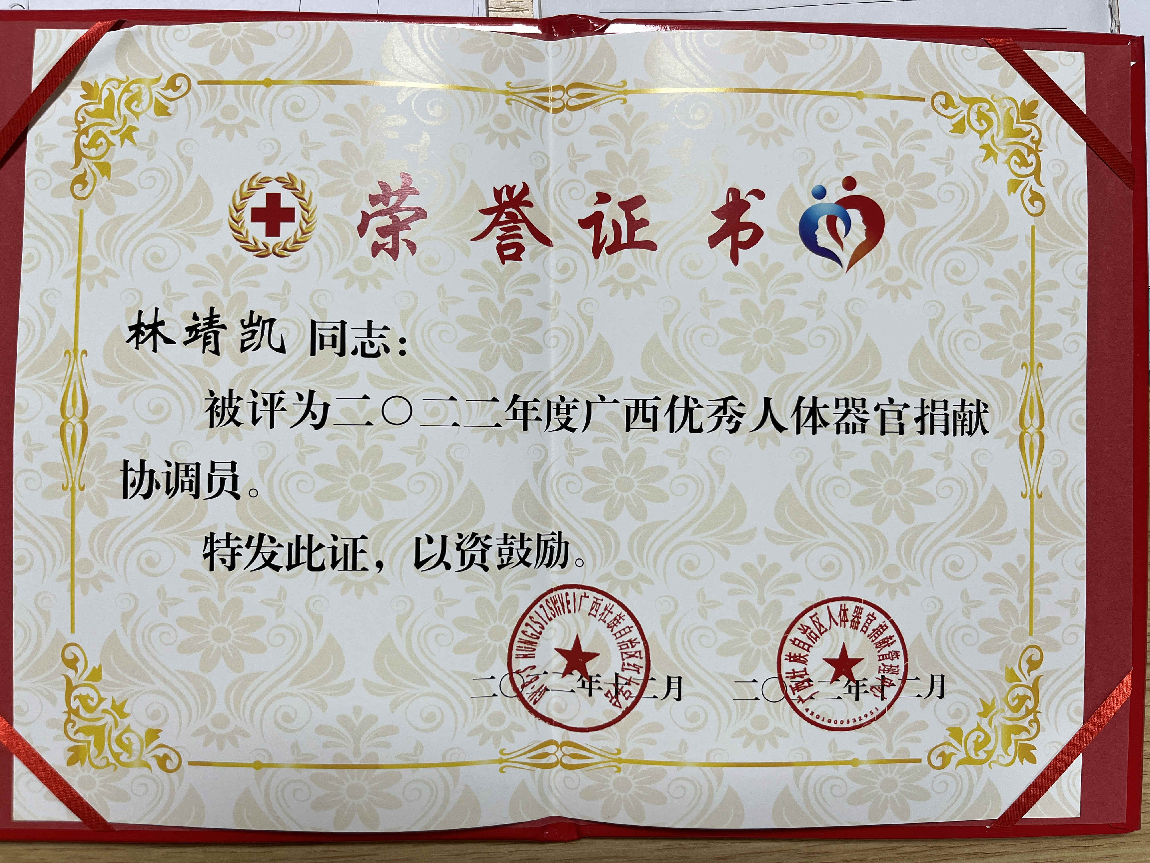2022年,林靖凯作为365bet官方游戏_线上365bet_bet28365365娱乐场红十字会器官协调员,为推动自治区和365bet官方游戏_线上365bet_bet28365365娱乐场的器官捐献工作作出了巨大贡献,荣获了广西优秀人体器官捐献协调员称号,这不仅是对他工作成绩的鼓励与肯定,更是对他成长的见证。