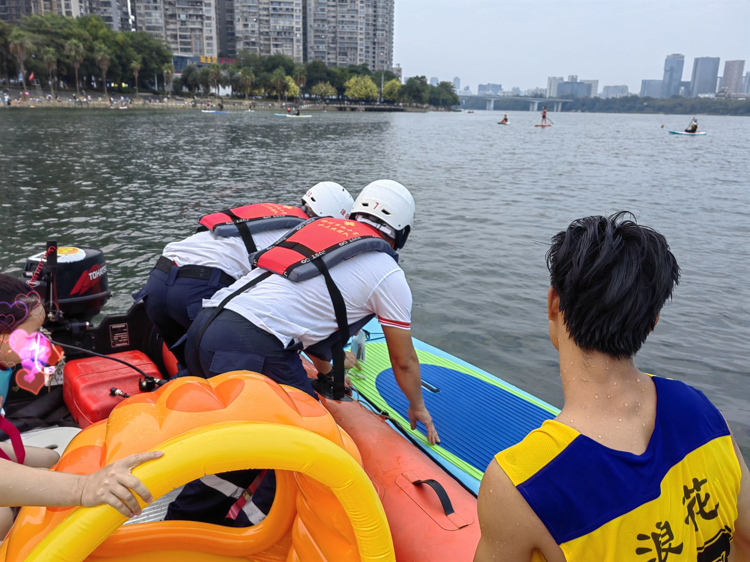 “我们下午大概 6 点多刚好巡逻到金沙角那个位置,便听到呼救声,于是急忙赶过去了解情况,发现是一家三口在玩桨板时不慎弄掉浆,体力不支无法划回岸边,看到我们在巡逻后便向我们求助。”参与救人的志愿者李荣平回忆道。三位志愿者合力将浆板上的群众接到冲锋舟上,并用绳子固定好浆板后将求助群众安全送到岸边。