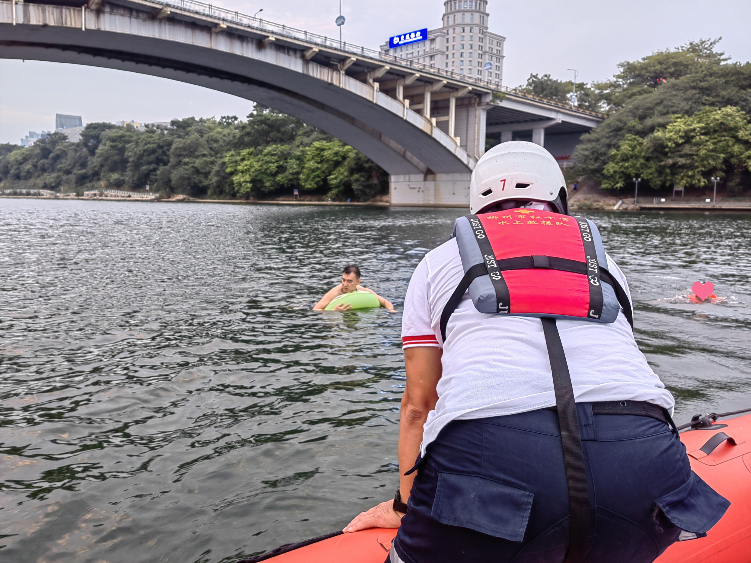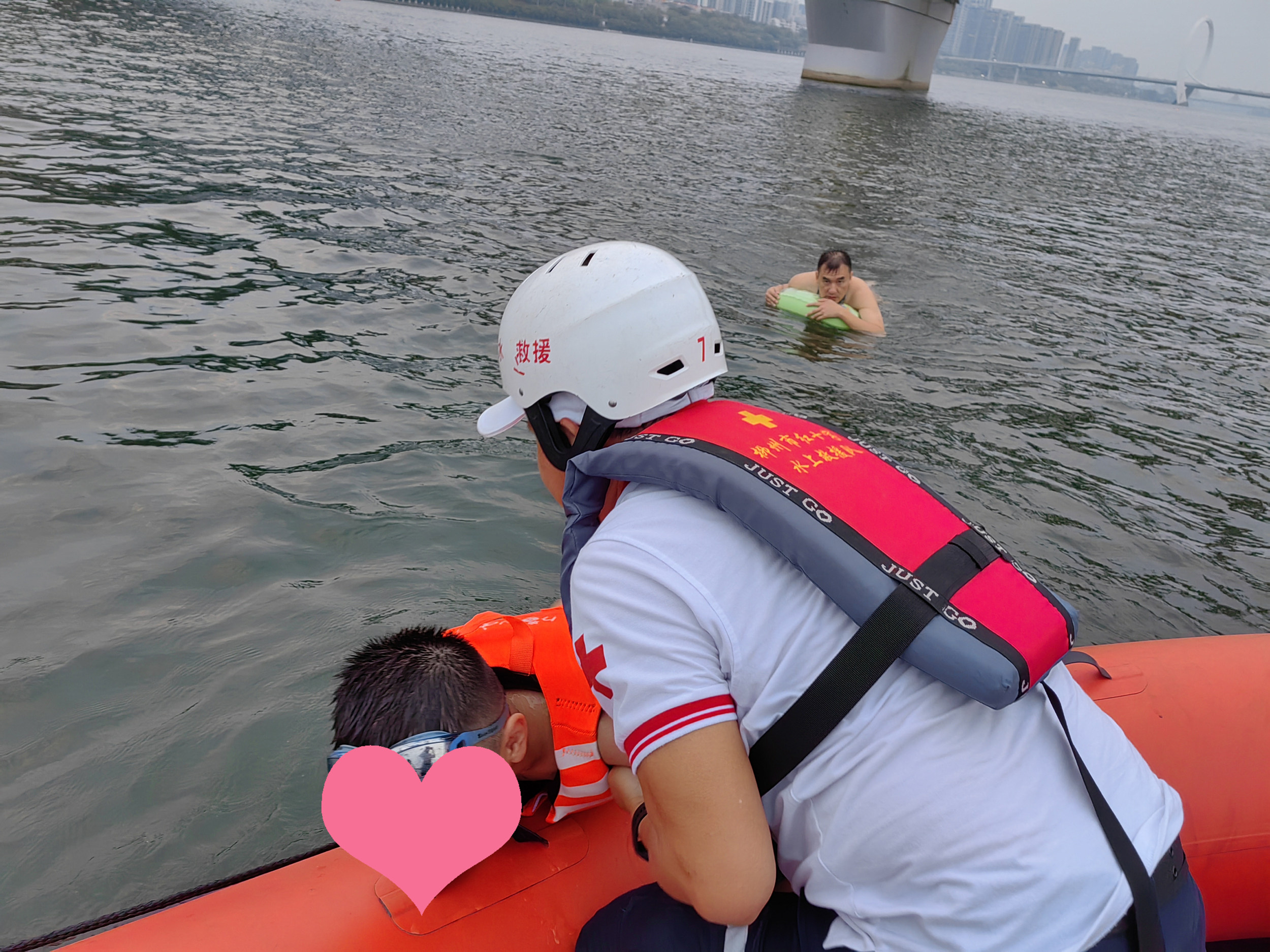 救援队在返程途中,行至壶东大桥附近时,志愿者们又偶遇一对因游泳圈漏气而被困于江中的父子,“我们到他们身边时,游泳圈已经肉眼可见地瘪下去了,而且那个父亲没有穿戴任何救生设备,我们再晚到一刻,他们的危险就多增一份。”志愿者们说道。最后在志愿者的护送下,他们最终安全上岸。