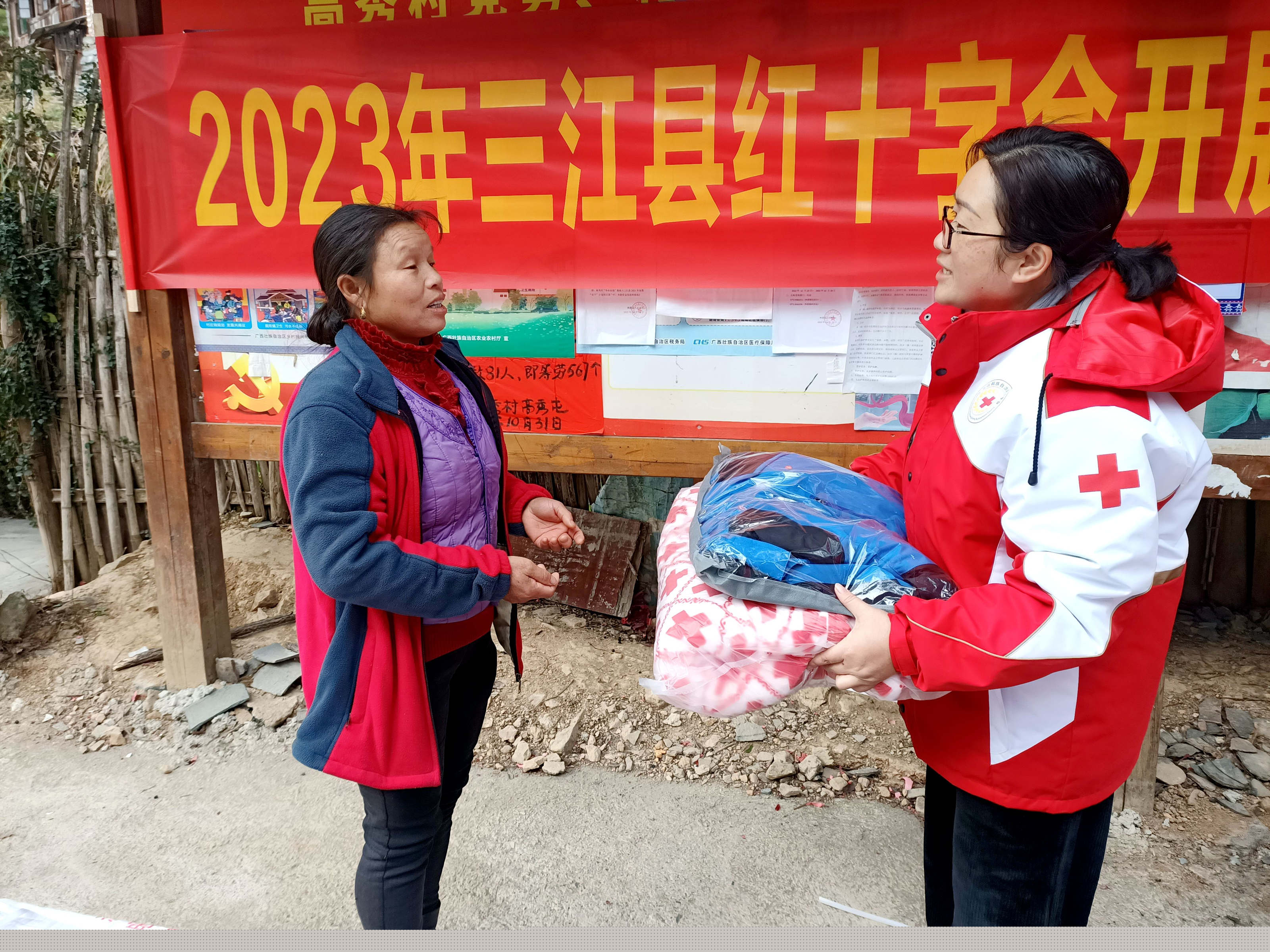 1月19日,三江县红十字会领导(右一)为高秀村群众发放慰问物资