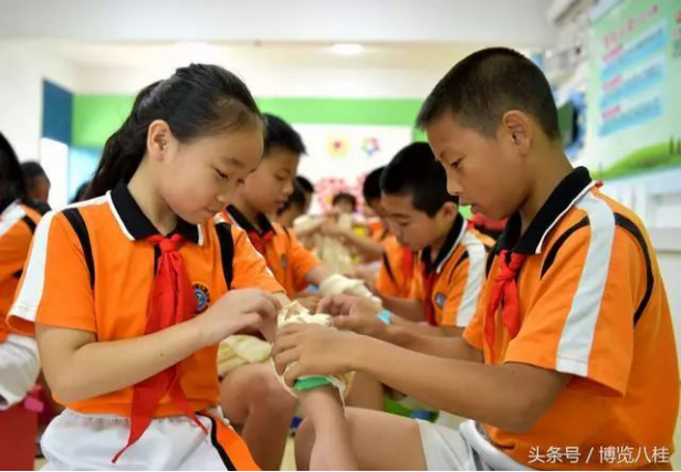 ▲5月28日,广西365bet官方游戏_线上365bet_bet28365365娱乐场柳太路小学的学生们在学习伤口包扎知识。